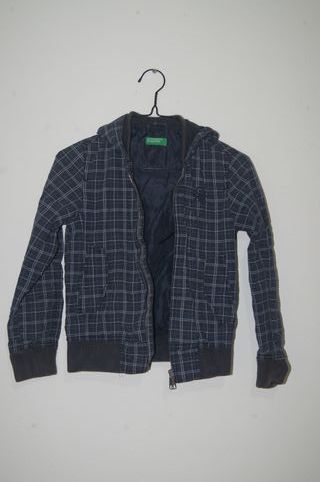 Casaco infantil da Benetton, tamanho 12 anos, em bom estado. - Padrão xadrez em tons de azul escuro e branco. - Fecho de correr frontal. - Capuz. - Punhos e barra em malha canelada.