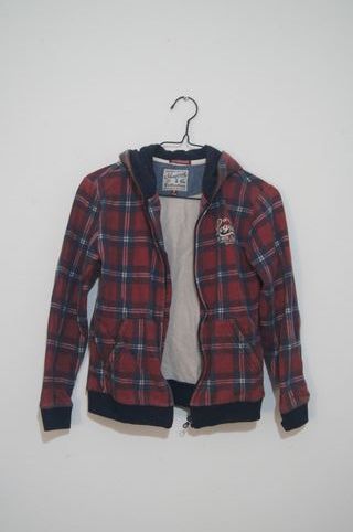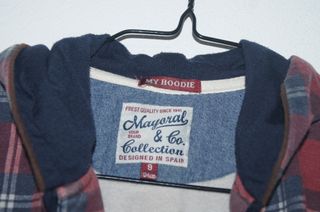 Casaco infantil com padrão xadrez, em bom estado. - Padrão xadrez em vermelho e azul. - Capuz. - Fecho de correr. - Bolsos frontais. - Mayoral.