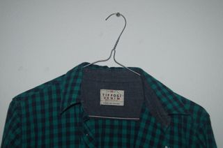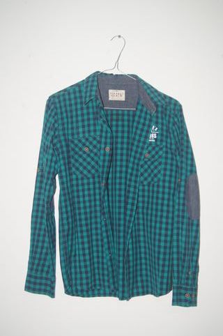 Camisa de xadrez da marca Tiffosi, tamanho 15 anos. - Padrão xadrez em verde e azul escuro. - Gola e detalhes em ganga. - Bolsos frontais com botões. - Patch com logo na manga.