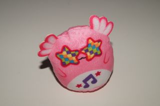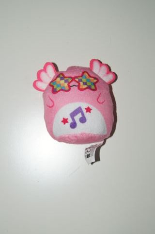 Pelúcia pequena em formato de almofada, na cor rosa. - Detalhes de estrelas coloridas nos óculos. - Símbolo musical roxo. - Pequenas estrelas vermelhas.