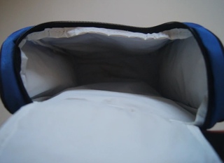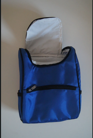Lancheira azul em tecido. - Fecho de correr frontal. - Bolso lateral.