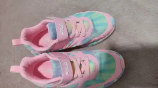 Sapatilhas Fila para menina com um design tie-dye vibrante. - Cor principal rosa com detalhes coloridos. - Fecho de velcro para ajuste fácil. - Detalhe de logo Fila na lateral e na sola. Valor dos dois pares ambos usados uma vez