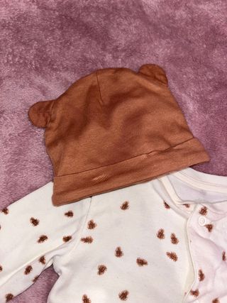 Conjunto de body e gorro. Body branco com detalhes castanhos e gorro castanho. Tamanho 0-3 meses. Conjunto da Primark.