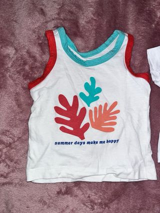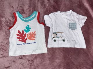 Conjunto de 2 blusas e uma camisa para bebé. A blusa verde é da Primark. Tamanho: 3-6 meses.