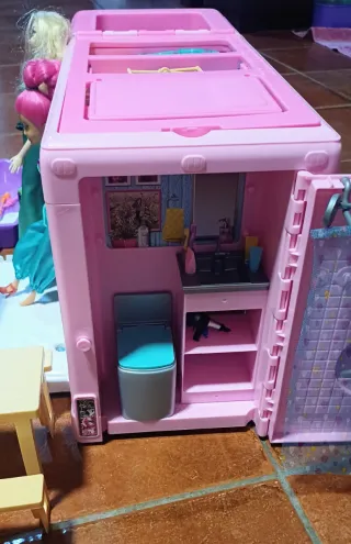 Autocaravana rosa da Barbie, perfeita para aventuras. - Design icónico da Barbie. - Detalhes em rosa e branco. - Janelas com cortinas. - Inclui 2 Barbie. - Inclui caixa com roupa para as Barbie.