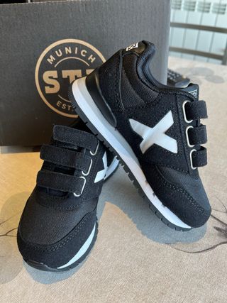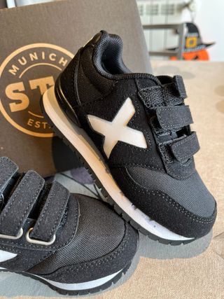 Sapatilhas Munich pretas para criança. Com fecho de velcro para um ajuste fácil. - Cor: Preto - Design com o icónico X da Munich em branco - Fecho de velcro - Sola branca e preta