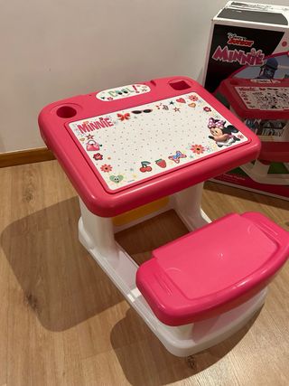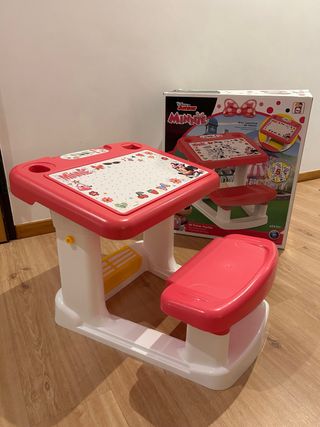 Mesa e banco infantil com o tema da Minnie Mouse. - Design colorido e divertido. - Superfície de trabalho. - Inclui banco. - Ideal para atividades criativas. A Minha Primeira Secretária da Minnie – Escrever, pintar, desenhar, jogar … A superfície de trabalho grande da mesa, feita de plástico de alta resistência, é perfeito para as crianças a expressar sua criatividade através de desenhos. Tem uma superfície de trabalho grande, um banco e apoio para os pés; tudo isto com plástico de alta resistência e durabilidade. A mesa tem um espaço para armazenar lápis e lápis de cor. Materiais de desenho não incluídos. Dimensões: 57,5×72,5×49