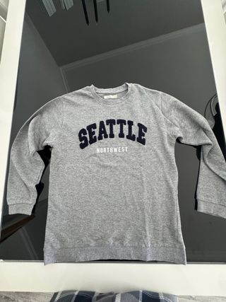 Camisola cinza com SEATTLE NORTHWEST bordado em azul marinho. - Gola redonda. - Mangas compridas. - Tecido macio e confortável.
