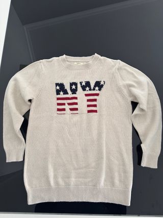 Camisola de malha da marca Sfera com um design inspirado na bandeira americana. - Cor bege - Padrão NY com estrelas e riscas - Gola redonda - Mangas compridas