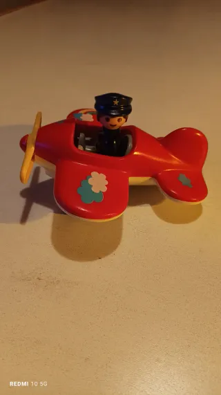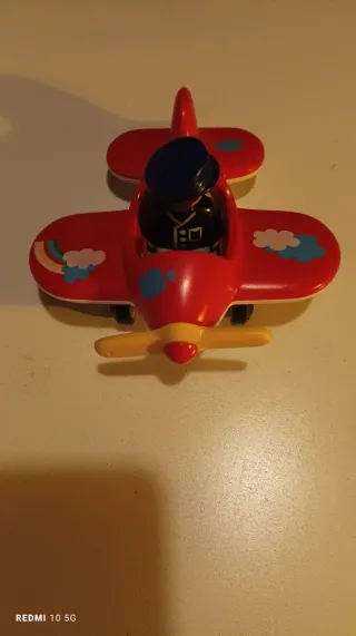 Avião de brinquedo em plástico vermelho, com um piloto. - Hélice amarela. - Detalhes de nuvens nos lados.