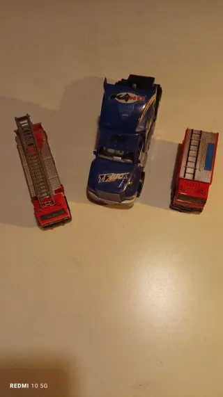 Conjunto de três veículos de brincar, incluindo um camião pesado e dois camiões de bombeiros. - Camião pesado azul e branco. - Camião de bombeiros vermelho com escada. - Camião de bombeiros vermelho Fire Brigade.