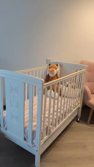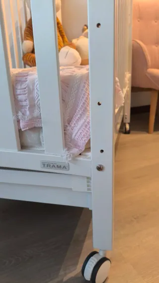 Berço branco marca TRAMA, com gavetão, em bom estado e pronto p/ uso. Inclui colchão e resguardo de colchão. Bonito motivo infantil na frente do berço. - Berço de cor branca marca TRAMA. - Inclui colchão. - Inclui resguardo de colchão. O gavetão perdeu a segurança atrás e se for puxado com muita força cai, tem que se ter cuidado. Colocámos uns parafuso de madeira para a gaveta não partir mais nessas zonas (foto 4) A lateral era rebaixável mas ficou presa em cima. Talvez dê para arranjar (foto 8) Algumas marcas de uso (foto 9 e 10). Peluches e colcha não incluídos. Levantamento em Leiria. Estou disponível p/ mais esclarecimentos