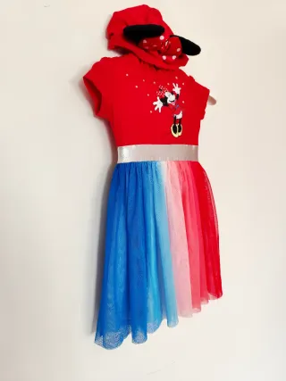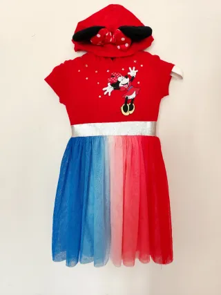 Vestido em tons de vermelho e azul da prestigiada marca Disney (Minnie Mouse) em muito bom estado Vestido para Menina com reduzidos sinais de uso, sem defeitos ou danos Vestido com saia folheada colorida e forro interior Vestido com elasticidade na cintura Artigo original da marca Disney Vestido com carapuço Tamanho: 4/5 anos Medidas: Ombros: 28 cm Cava a cava: 30 cm Comprimento: 60 cm Material: 85% Algodão 5% Spandex (elastano) Peso: 210 gramas
