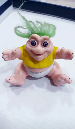 Figura do Bebé Sinclair, personagem da série Dinossauros da Disney. - Cabelo verde. - Roupa amarela e fralda branca. - Olhos roxos. -Anos 90 -Tamanho 10cm