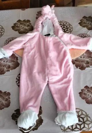 Fato de unicórnio em pelúcia rosa, ideal para festas ou Carnaval. - Tamanho 1/2 anos. - Capuz com detalhes de unicórnio. - Fecho frontal. - Punhos e barras em branco.
