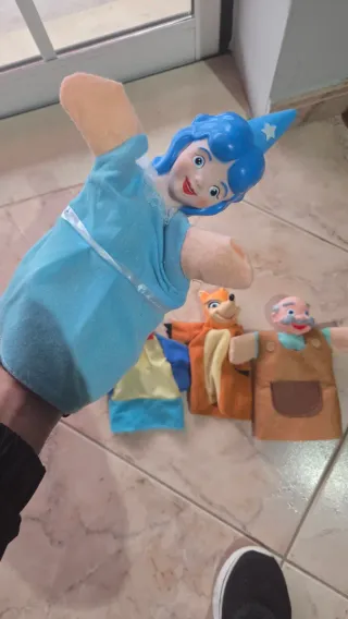 Conjunto de 4 fantoches de mão para crianças, ideais para teatro de fantoches, histórias e desenvolvimento de imaginação. Inclui: • 1 Fada • 1 Carapinteiro/Avô • 1 Raposa • 1 Gnomo Cabeça em plástico rígido e corpo em tecido Tamanho: aprox. 25–30 cm cada Estado: bom, limpos e prontos a usar. Ótimo para brincar ou para uso educativo.