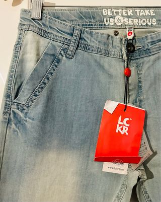 Calças de ganga com um toque moderno e descontraído. - Cor azul claro com efeito desgastado. - Bolsos frontais. - Cintura elástica. - Novas com etiqueta. - Tamanho: 170/176 (K)