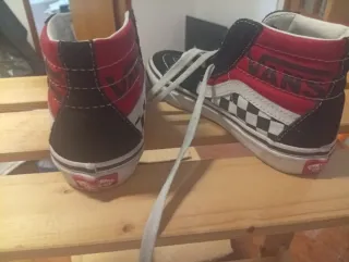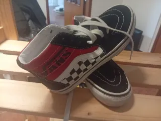 Sapatilhas de cano alto da Vans, modelo Sk8-Hi. - Design com padrão xadrez e detalhes em vermelho e preto. - Fecho com atacadores brancos. - Sola de borracha branca.