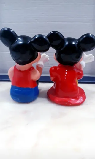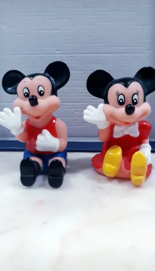 Conjunto de bonecos clássicos da Disney em borracha, Mickey e Minnie. São perfeitos para colecionar ou para as crianças brincarem. Dos anos 90 tem 10cm tamanho. - Bonecos em borracha. - Incluem som. - Personagens: Mickey e Minnie.