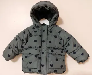 Casaco acolchoado de cor verde com corações azuis da prestigiada marca Zara em muito bom estado Casaco acolchoado para Menina sem sinais de uso, sem defeitos ou danos (passa por novo) Casaco acolchoado com carapuço e bolsos frontais A apontar a etiqueta interior ter sido cortada Tamanho: 12-18 Meses (86 cm) Peso: 400 gramas