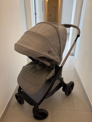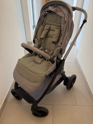 Carrinho de bebé Chicco Ballagio em tons de cinza e bege. Ideal para passeios confortáveis. - Capota ajustável. - Cinto de segurança de 5 pontos. - Barra frontal. - Rodas com suspensão.