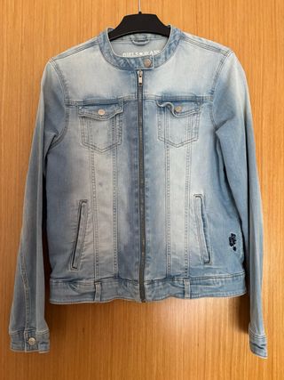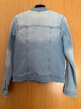 Casaco de ganga azul claro para menina da C&A. Com fecho à frente e gola redonda. - Dois bolsos no peito com botão. - Dois bolsos laterais. - Punhos com botão.