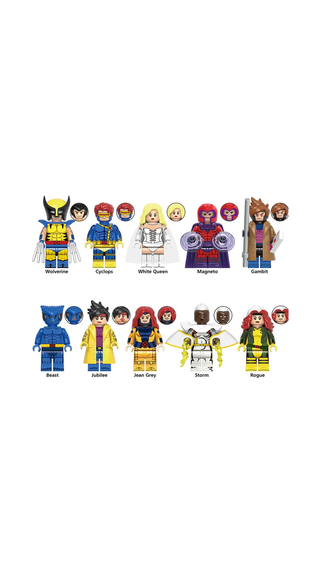 Coleção de 10 bonecos minifiguras compatíveis com Lego, universo dos X-Men da Marvel. Com: - Wolverine (Classic) - Cyclops - White Queen - Magneto - Gambit - Beast - Jubilee - Jean Grey - Storm (Gold Team) - Rogue Novos, ainda nos sacos fechados. Inclui tudo o que está nas fotos (bonecos + acessórios). Só vendo a coleção completa, não vendo separado nem faço trocas.