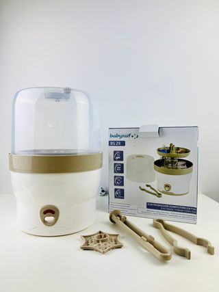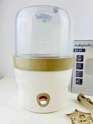 Esterilizador de biberões elétrico a vapor, da marca Babyruf, novo na caixa.