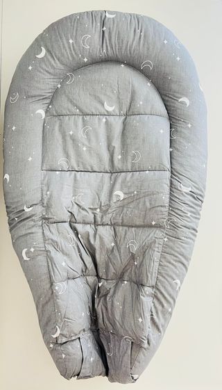 Ninho para bebés da marca Totsy Baby, 90x50cm, em cinza com padrão de estrelas e luas, novo e sem caixa.