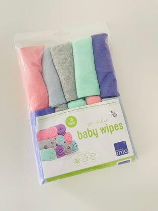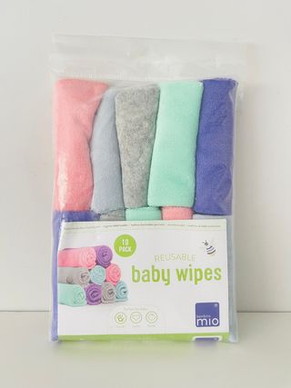 Conjunto de 10 toalhitas reutilizáveis da marca Bambino Mio, macias e absorventes, perfeitas para a pele delicada do bebé.