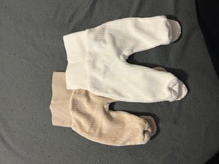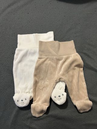 Conjunto de calças de inverno para bebé, perfeitas para manter os mais pequenos quentinhos. - Duas calças com pé. - Uma calça branca canelada. - Uma calça bege canelada. - Detalhe de carinha de urso nos pés.