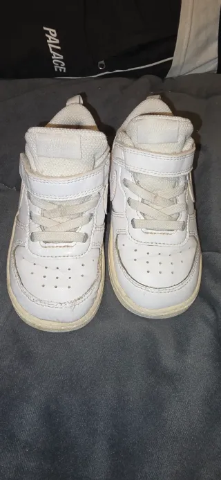 Par de sapatilhas Nike Air Force 1 em branco, tamanho para criança. São confortáveis e versáteis. - Design clássico. - Fecho de velcro e atacadores.