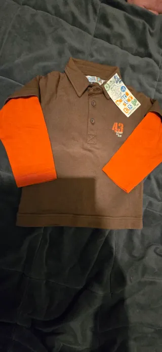 Camisola de manga comprida para menino, com um design moderno e cores vibrantes. Perfeita para o dia a dia. - Cor principal castanha com mangas em laranja. - Detalhe 43 no peito. - Gola polo com botões.