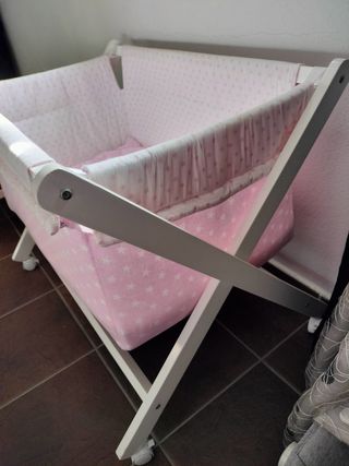 Berço em madeira com 4 roda, tecido rosa com estrelas estampada. Medidas do colchão 48X78 cm