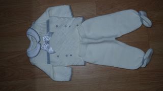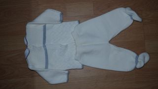 Conjunto de malha para bebé, ideal para os primeiros meses. - Cor creme com detalhes em azul. - Inclui casaco e calças com pés. - Fecho com botões. - Laço decorativo.