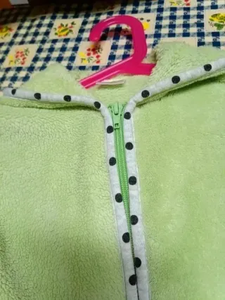 Roupão polar em tom verde menta, com fecho frontal e capuz. Apresenta um divertido padrão de bolinhas pretas e um aplique de urso. - Material polar macio. - Detalhes em tecido com bolinhas pretas. - Aplique de urso com laço.