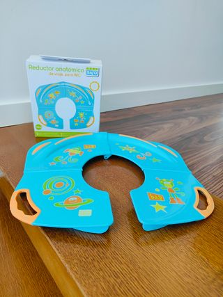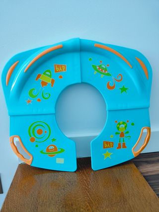Redutor anatómico de viagem para WC da marca Saro, em ótimo estado. - Ideal para crianças pequenas abaixo de 16kgs - Dobrável e fácil de transportar. - Design divertido com imagens espaciais. - Material plástico resistente e fácil de limpar.