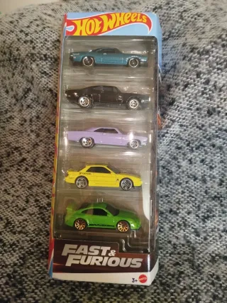 Conjunto de 5 carrinhos Hot Wheels da linha Fast & Furious. - Carrinho azul - Carrinho preto - Carrinho lilás - Carrinho amarelo - Carrinho verde