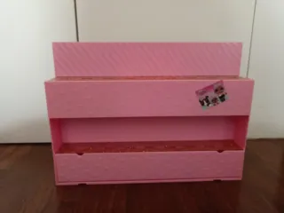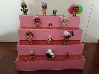 Conjunto de expositor rosa com padrão de ziguezague e várias bonecas LOL. - Expositor de 4 níveis. - Inclui 10 bonecas LOL. - Bonecas com acessórios variados. - Decoração com glitter rosa.