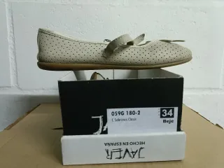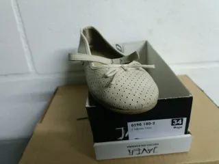 Sabrinas em pele bege, com um design clássico e elegante. Perfeitas para o dia a dia. - Material: Pele - Cor: Bege - Tamanho: 34 - Detalhe de laço - Sola em borracha