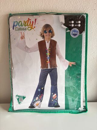 Disfarce de estilo hippie para criança, tamanho 7-9 anos da marca ATOSA. - Tamanho: 7-9 anos - Marca: ATOSA - Estilo: Hippie - Inclui: Camisola e calças - A camisola está com defeito numa manga (ver fotografias)