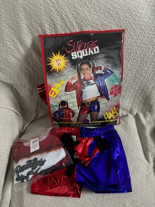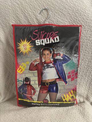 Disfarce da Harley Quinn do filme Esquadrão Suicida. - O fato não chegou a ser usado. - Tamanho XS, recomendado para idades entre 10-12 anos. - Inclui casaco, top, luva, calções e collants. - Não tem o cinto. - Design inspirado na personagem. - Ideal para festas temáticas ou Halloween.