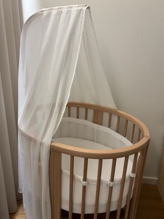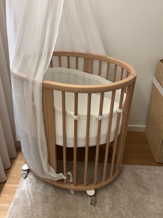 Berço Stokke Mini versão 3 em madeira natural. - Design oval. - Rodízios para mobilidade.