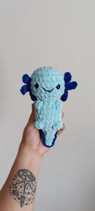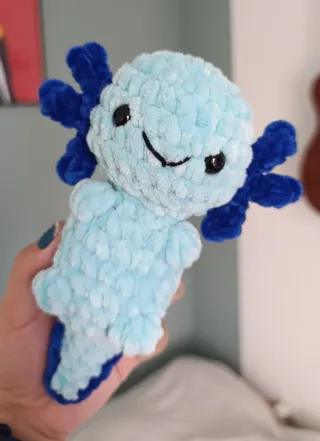 Adorável axolote feito à mão! Confeccionado em crochê com detalhes em azul escuro, tem 17 cm de altura e foi feito com todo cuidado. Feito com linha pelúcia, para deixar seu bichinho mais macio. Um mimo colecionável, perfeito para decorar ou presentear. Foto com Olhos com trava de segurança e enchimento antialérgico. #amigurumi #crochet #axlotl #handmade #axolote #azul