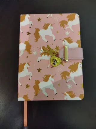 Diário encantador com capa rosa e estampa de unicórnios dourados e brancos. Possui um fecho com fivela rosa e detalhes dourados, acompanhado de um cadeado em formato de coração e sua chave. - Capa com design de unicórnios. - Fecho com fivela e detalhe dourado. - Inclui cadeado em formato de coração e chave.