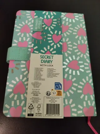 Diário com capa decorada com corações cor-de-rosa e detalhes prateados. - Capa com padrão de corações. - Inclui cadeado em forma de coração. - Vem com chave para o cadeado. - Fecho em tira verde.