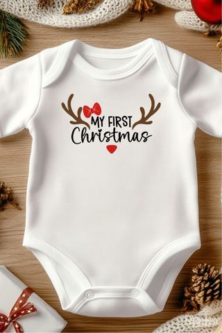 Body branco para bebé com o tema My First Christmas. Perfeito para celebrar a primeira época natalícia. - Design com chifres de rena e laço vermelho. - Frase My First Christmas em preto. - Pequeno coração vermelho abaixo da frase.