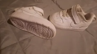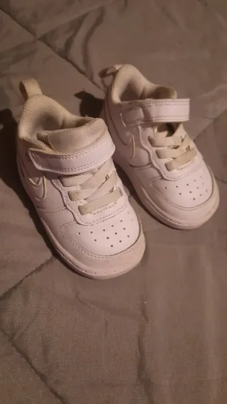 Sapatilhas Nike em branco, tamanho 19.5. - Fecho de velcro. - Detalhe de swoosh lateral. - Sola de borracha.