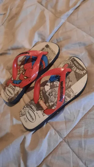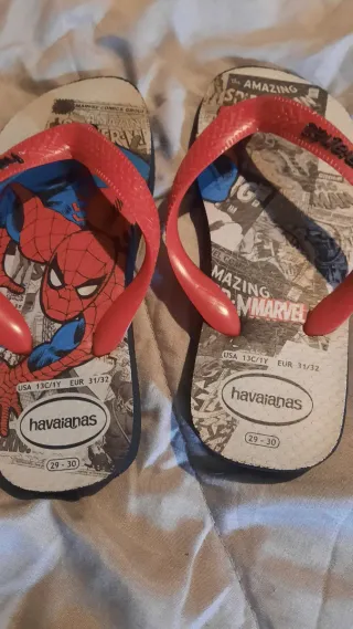 Chinelos infantis da Havaianas com estampa do Homem-Aranha. - Estampa do Homem-Aranha e quadrinhos da Marvel. - Tira vermelha. - Tamanho EUR 31/32 (29-30). - Logo da Havaianas na tira.