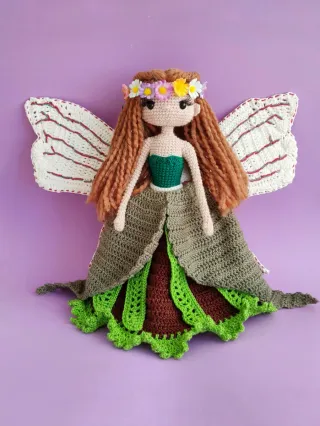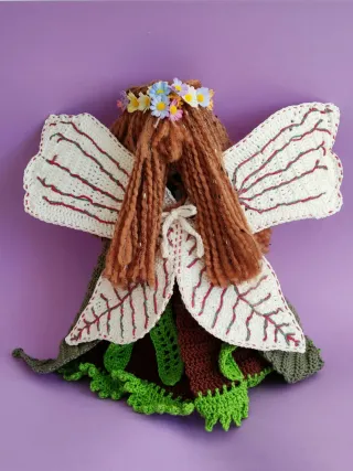Boneca Alani feita à mão em amigurumi, com detalhes encantadores. Tem 35 cm - Cabelo castanho trançado. - Vestido verde e saia em tons de terra e verde. - Asas brancas com detalhes. - Adorno floral na cabeça.